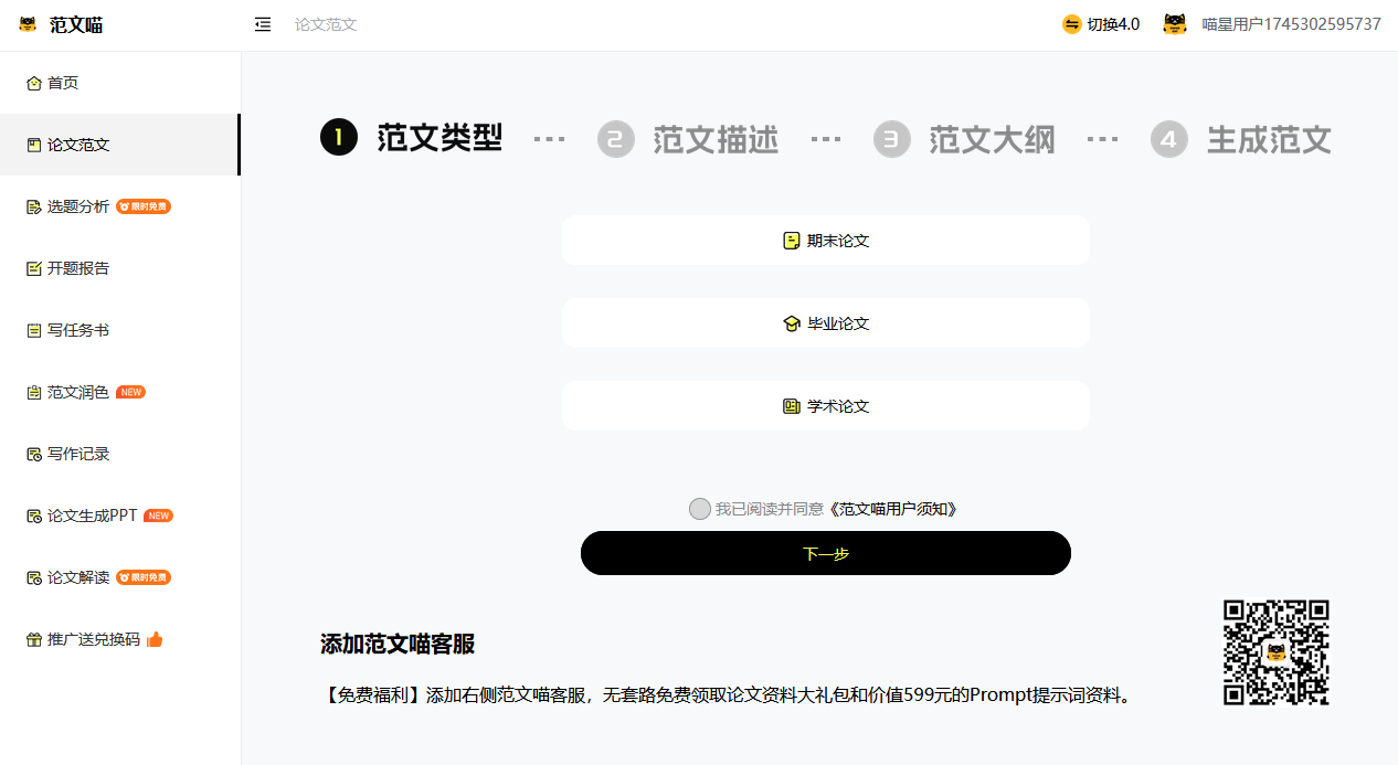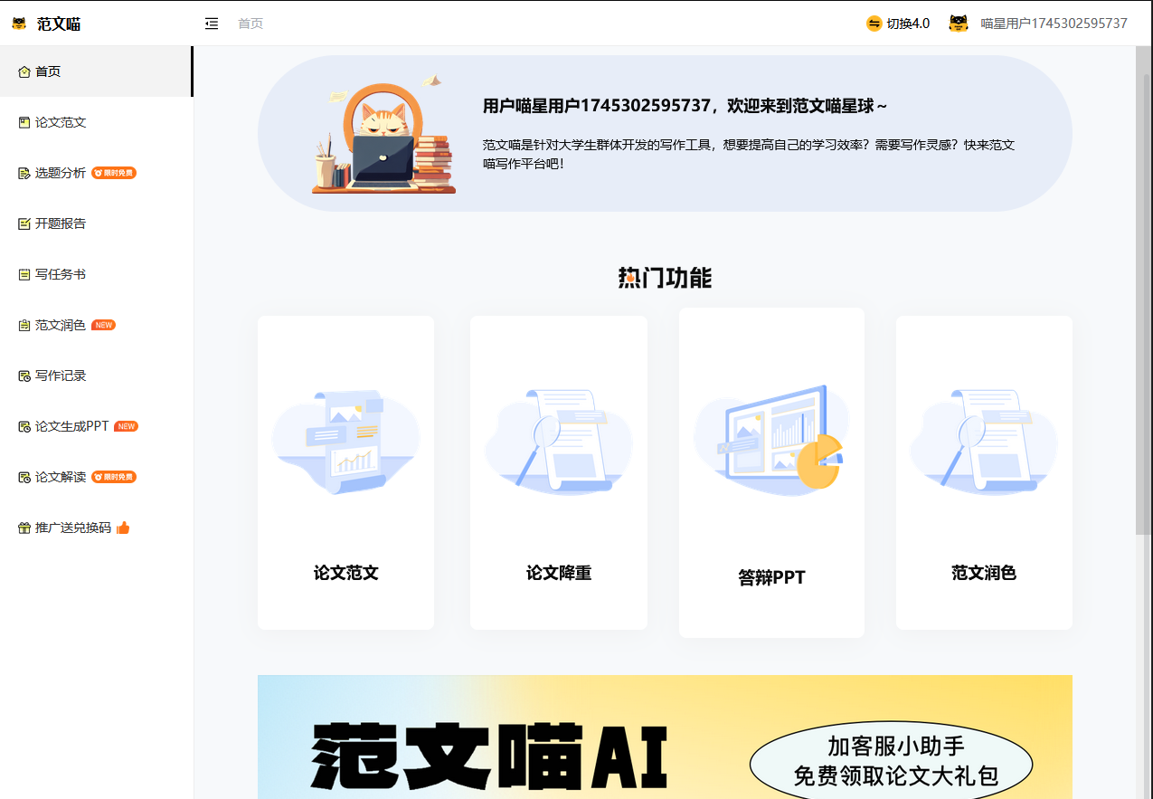 范文喵是一款专为大学生打造的AI论文生成工具,旨在借助AI技术提高学生的写作能力和效率。该工具构建了一个全方位的沉浸式论文写作平台,覆盖从选题、开题到范文创作、毕业答辩的全过程,帮助大学生节省了大量时间,提高了他们的学术写作效率和水平,是大学生学术研究道路上的得力助手。